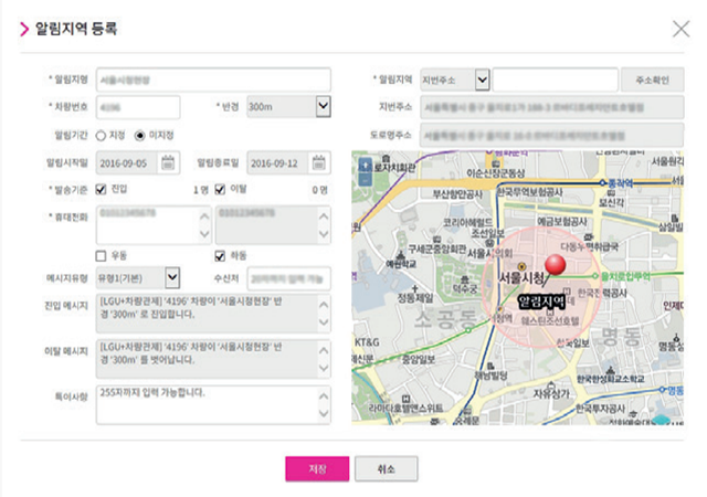 ¾Ë¸² Áö¿ªÀ» ¼³Á¤Çϸé, Â÷·®ÀÌ ¾Ë¸²Áö¿ª¿¡ ÁøÀÔÇÒ ¶§ ¾Ë¸² ¸Þ½ÃÁö¸¦ Àü¼ÛÇÕ´Ï´Ù.